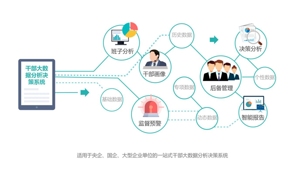 干部大數(shù)據(jù)分析決策系統(tǒng)是一款基于大數(shù)據(jù)思維的干部管理產(chǎn)品,該產(chǎn)品可從多個維度展現(xiàn)單位領(lǐng)導(dǎo)班子現(xiàn)狀,實現(xiàn)干部隊伍結(jié)構(gòu)、黨風(fēng)廉政、后備培養(yǎng)、績效考評、經(jīng)營業(yè)績、民主生活會、談心談話等關(guān)鍵數(shù)據(jù)的線性分析和走勢預(yù)測,輔助領(lǐng)導(dǎo)優(yōu)化班子結(jié)構(gòu)配置;通過對領(lǐng)導(dǎo)干部成長路徑、工作分工、個人訴求、日常實績、現(xiàn)實表現(xiàn)、思想動態(tài)、生活軌跡等數(shù)據(jù)動態(tài)分析,實現(xiàn)干部精準(zhǔn)畫像,并建立實時“預(yù)警燈”,進(jìn)行實時預(yù)警提醒。系統(tǒng)還能自動生成考核、調(diào)整、年終總結(jié)等多類報告,實現(xiàn)全方位、立體化的數(shù)據(jù)分析。采用該產(chǎn)品可大大減輕干部管理的工作量,為選人用人、干部監(jiān)督、梯隊建設(shè)、班子評優(yōu)等工作提供針對性的對策和建議,輔助領(lǐng)導(dǎo)分析決策。