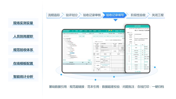 建立標準驗收量化體系,規(guī)范了工程驗收規(guī)范標準:系統(tǒng)建立了一套由工程創(chuàng)建、驗評劃分、驗評記錄、驗評臺賬、階段性驗收組成的驗收量化體系,規(guī)范了工程驗收量化標準,填補了工程驗收流程缺失的空白;