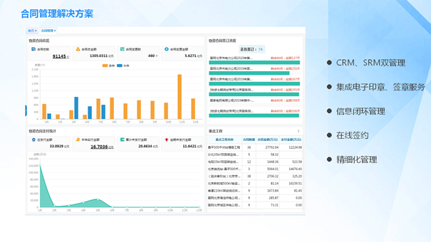 合同管理系統(tǒng)為企業(yè)提供合同全生命周期過程管理。該系統(tǒng)以企業(yè)CRM、SRM數(shù)據(jù)為基礎(chǔ),實現(xiàn)合同條款、合同起草、合同分包、合同變更、發(fā)票、收付款等信息閉環(huán)管理,通過集成第三方簽約服務(wù),實現(xiàn)合同、訂單的在線簽約,提升企業(yè)合同精細(xì)化管理水平和執(zhí)行效率。