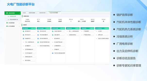 火電廠性能診斷平臺以火電廠生產(chǎn)數(shù)據(jù)為基礎(chǔ),對機(jī)組能耗水平進(jìn)行自動分析、評估和打分,為用戶提供機(jī)組的性能診斷依據(jù)和建議。平臺以歷史數(shù)據(jù)導(dǎo)入、實時數(shù)據(jù)接入方式獲取機(jī)組運行數(shù)據(jù),通過建立仿真計算分析模型,對影響機(jī)組運行性能的汽機(jī)、鍋爐、電氣設(shè)備數(shù)據(jù)進(jìn)行計算,結(jié)合內(nèi)置的專家團(tuán)隊性能診斷經(jīng)驗庫,為機(jī)組的高性能運行提供運行優(yōu)化、節(jié)能改造、檢修維護(hù)建議。