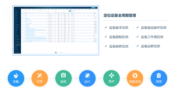 設備全生命周期管理:從設備采購、設備安裝調(diào)試、設備使用、設備報廢全過程進行跟蹤,并對設備使用期間的維修、拆除、驗收、移動等所有操作進行記錄,實現(xiàn)設備全生命周期管理。