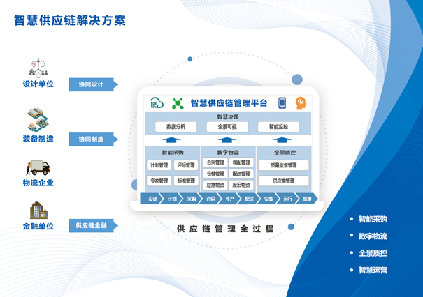 智慧供應鏈管理平臺,依托“云大物移智”新一代信息技術,打造智能采購、數(shù)字物流、全景質控三大業(yè)務鏈,為企業(yè)構建內外高效協(xié)同的智慧供應鏈體系。平臺能夠全面提升企業(yè)運營分析決策、資源優(yōu)化配置、風險監(jiān)控預警、數(shù)據資產應用、應急調度指揮等能力,使計劃匹配更精準、履約協(xié)同更高效、物資交付更快捷,為企業(yè)提供高質量、高效率的供應鏈管理支撐。