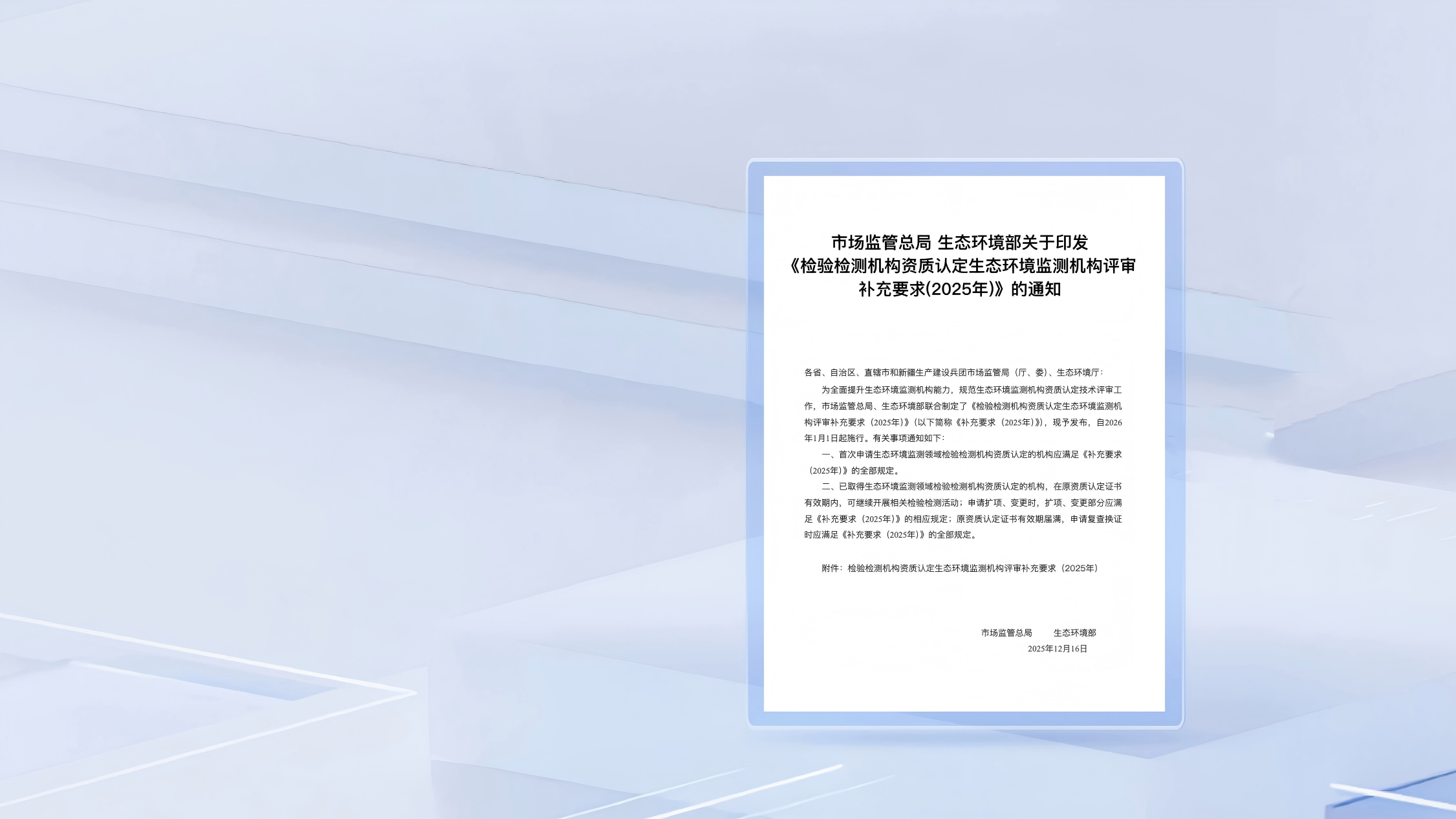 《檢驗(yàn)檢測(cè)機(jī)構(gòu)資質(zhì)認(rèn)定生態(tài)環(huán)境監(jiān)測(cè)機(jī)構(gòu)評(píng)審補(bǔ)充要求(2025年)》正式發(fā)布,并將于2026年1月1日起施行。